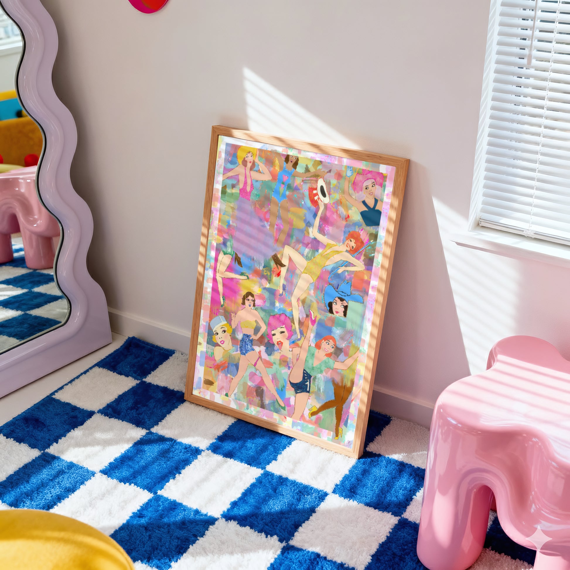 This lively, colorful collage poster brings a burst of vibrant energy and retro style to your walls. Featuring a group of playful, dancing burlesque style girls in eclectic glittering outfits in quirky dance poses, celebrate girlhood and the joy of female friendships by adding Girlypops to your gallery wall.
