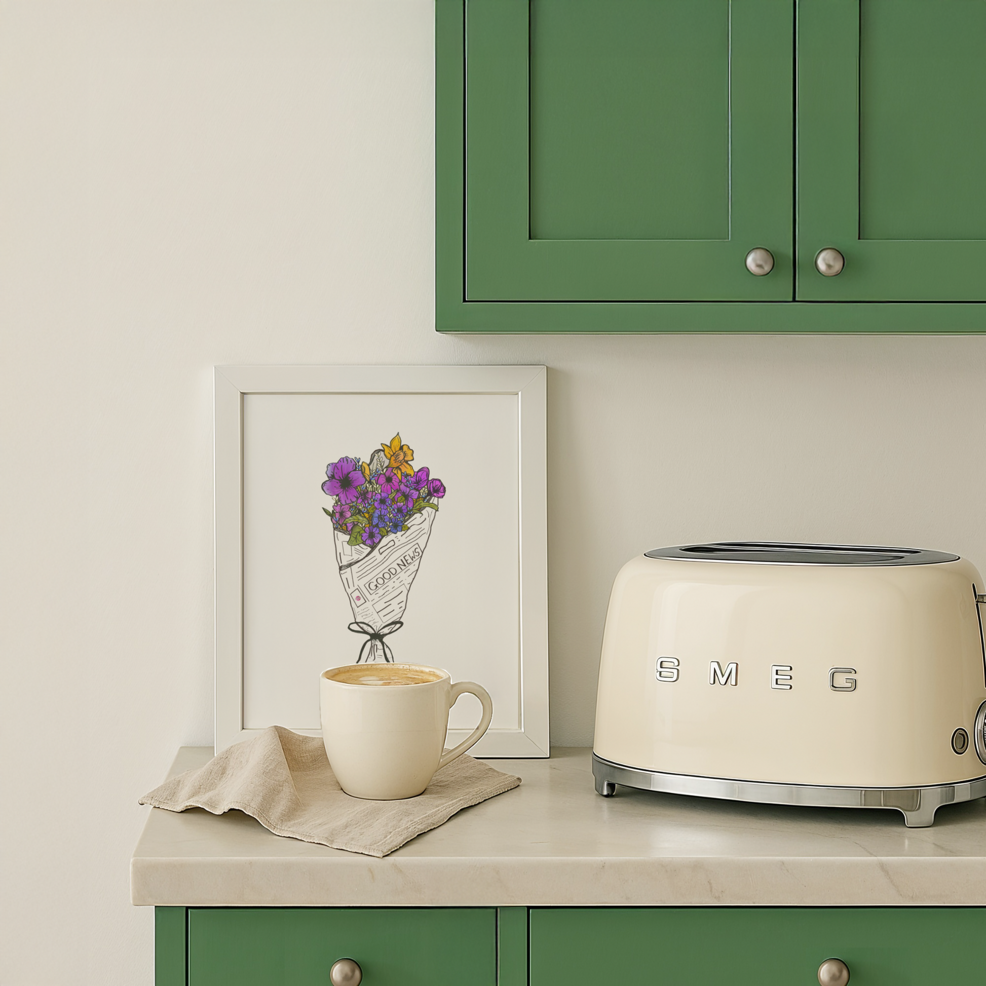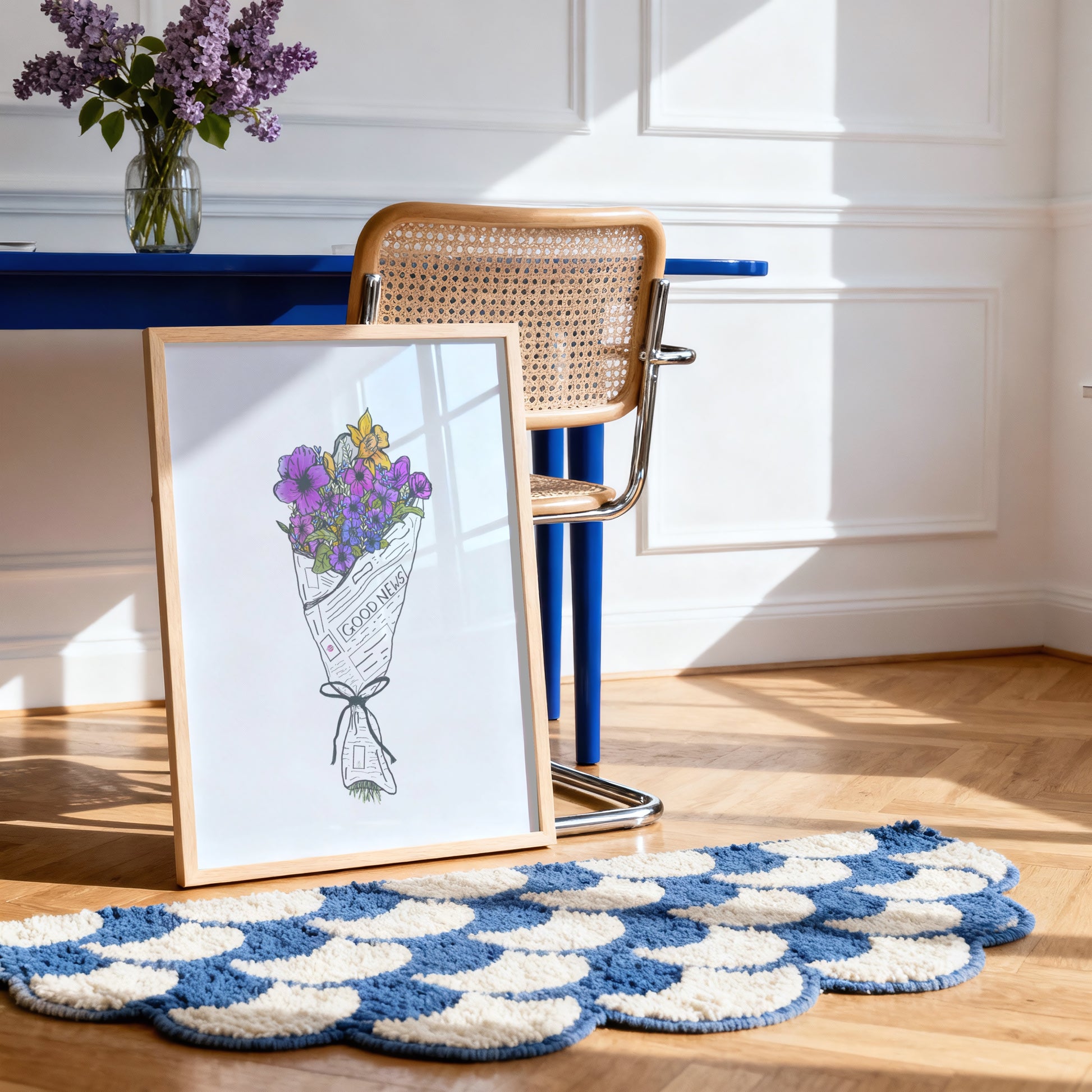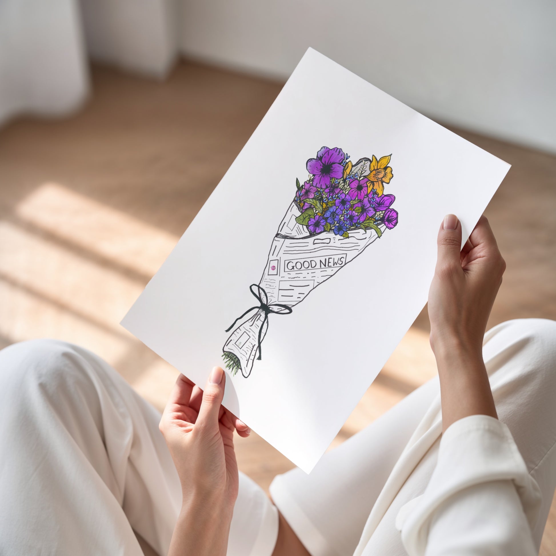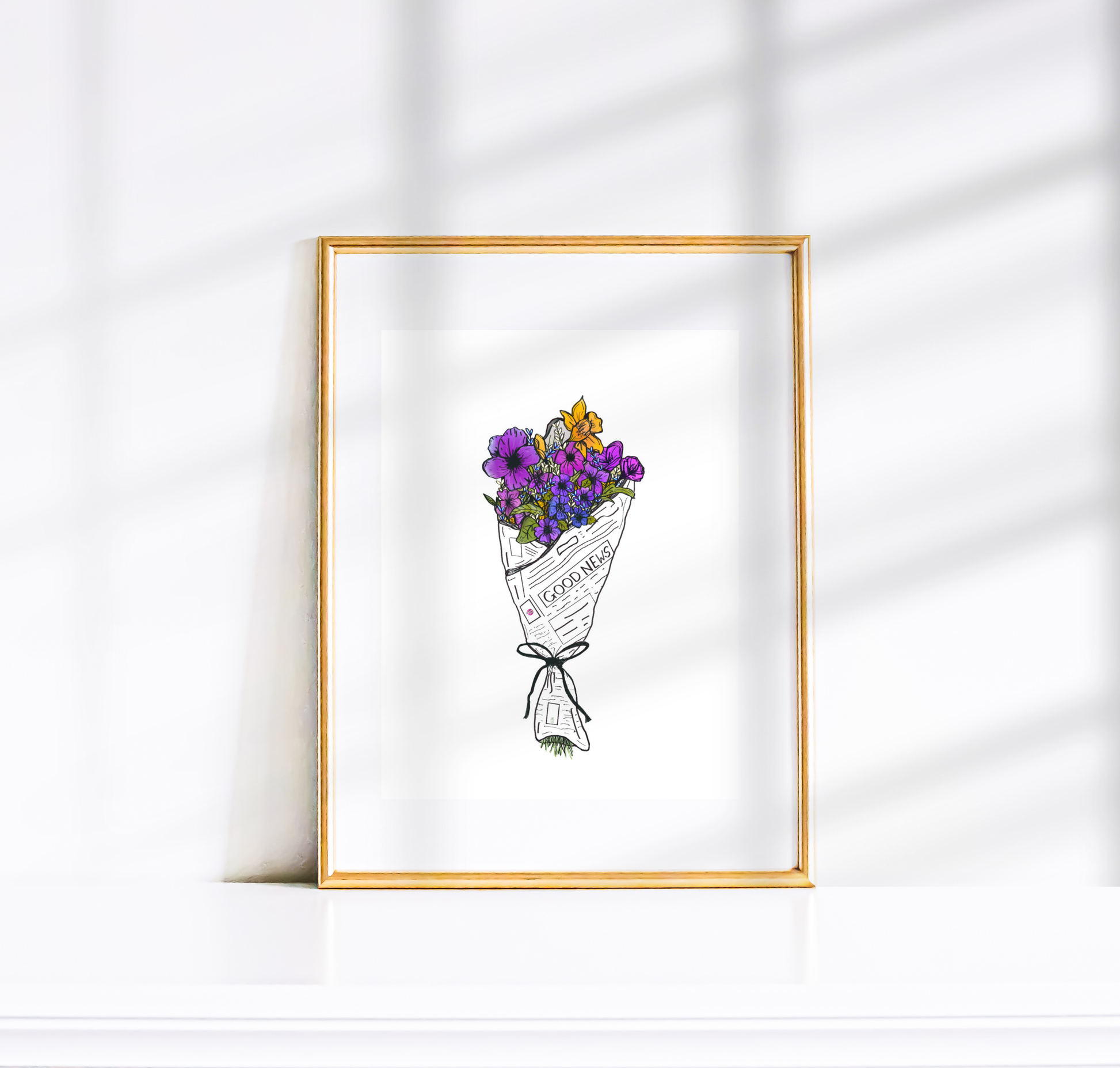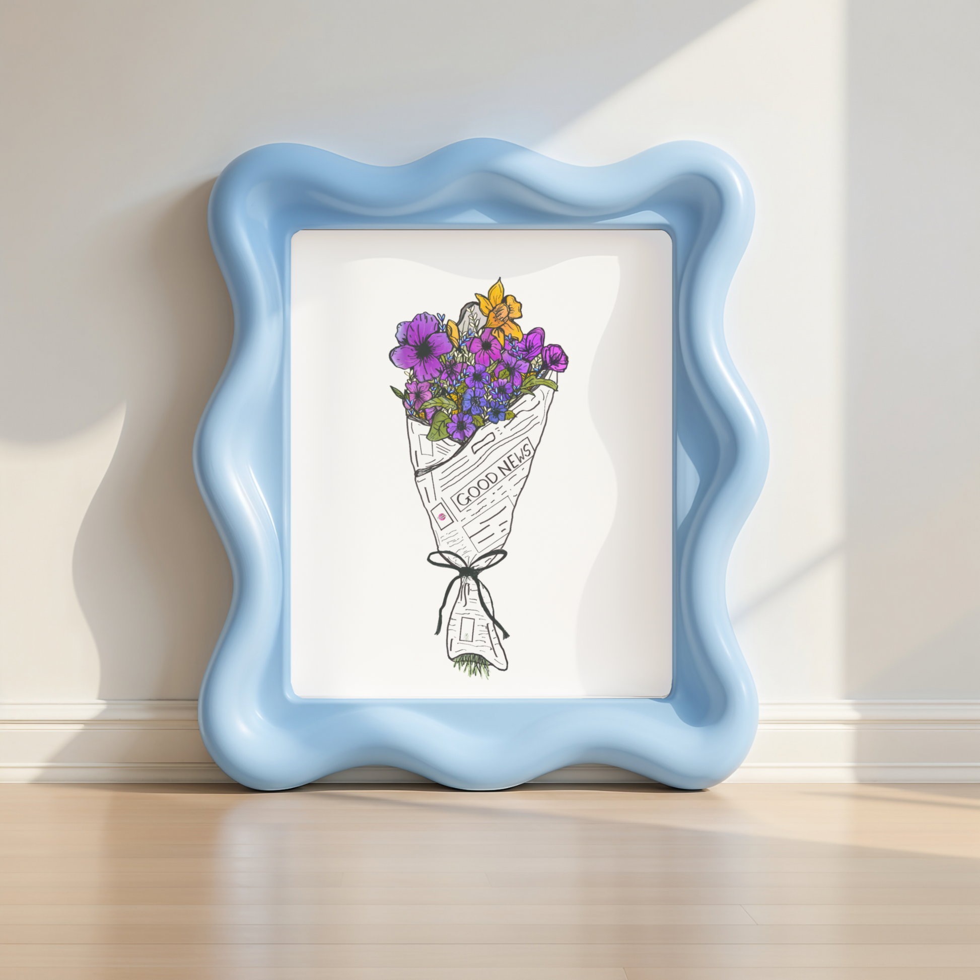 Featuring a vibrant floral bouquet wrapped in a newspaper featuring nothing but good news, this minimalistic yet colorful, cool-toned print brings a refreshing mix of nature and positivity to your home. Brighten your space with this classic happy art poster!
