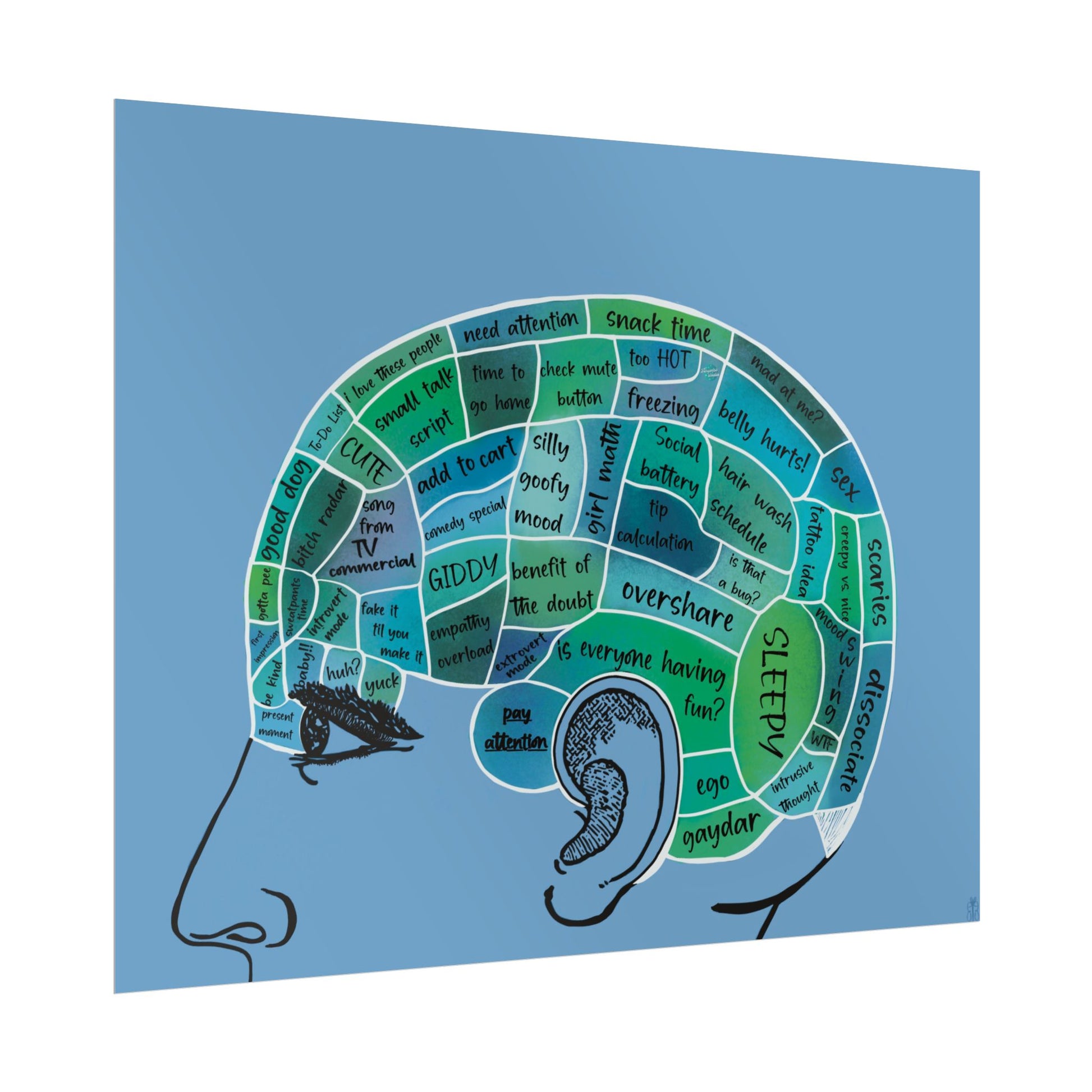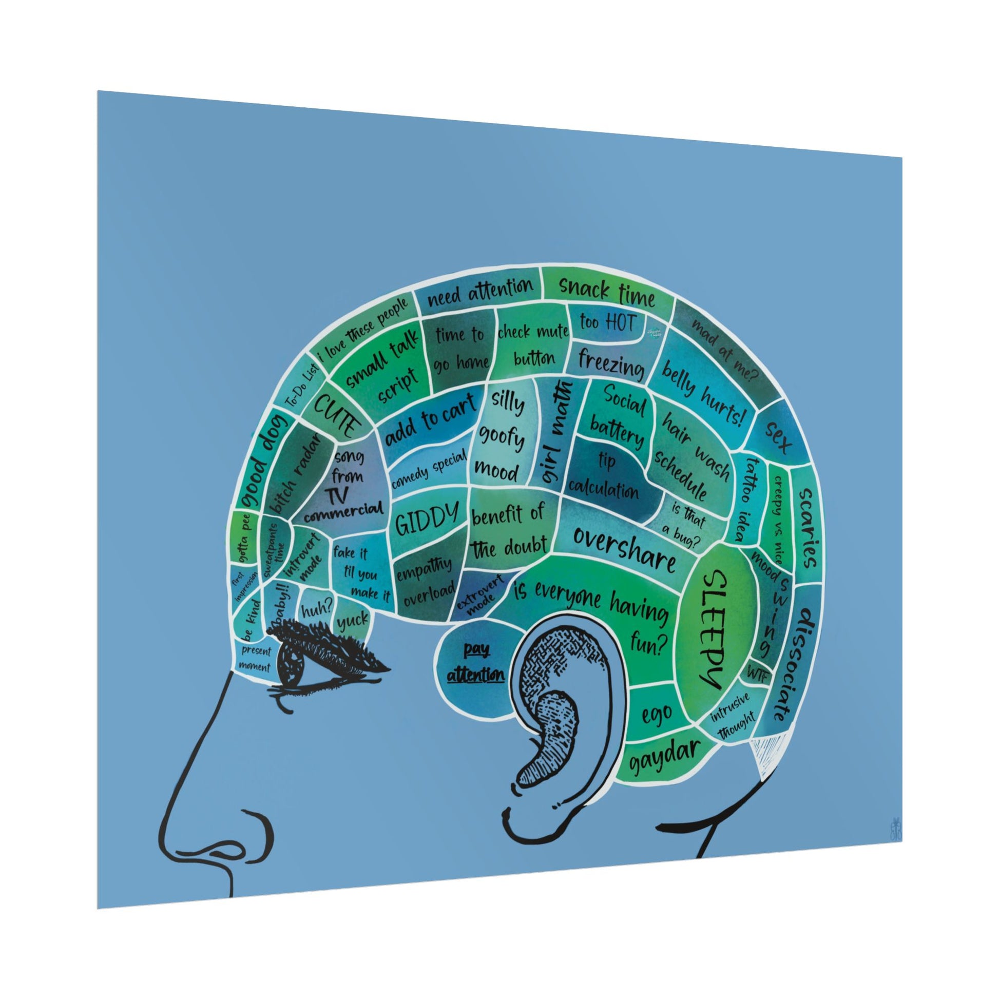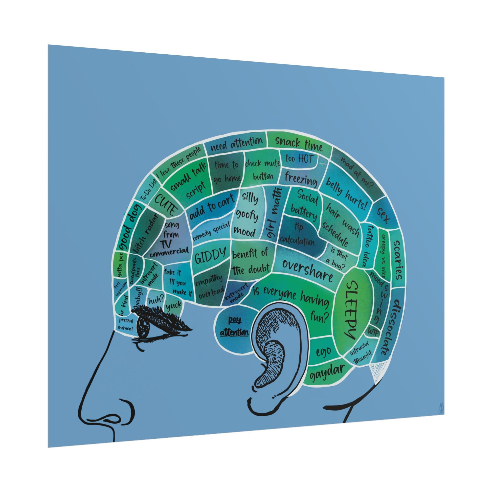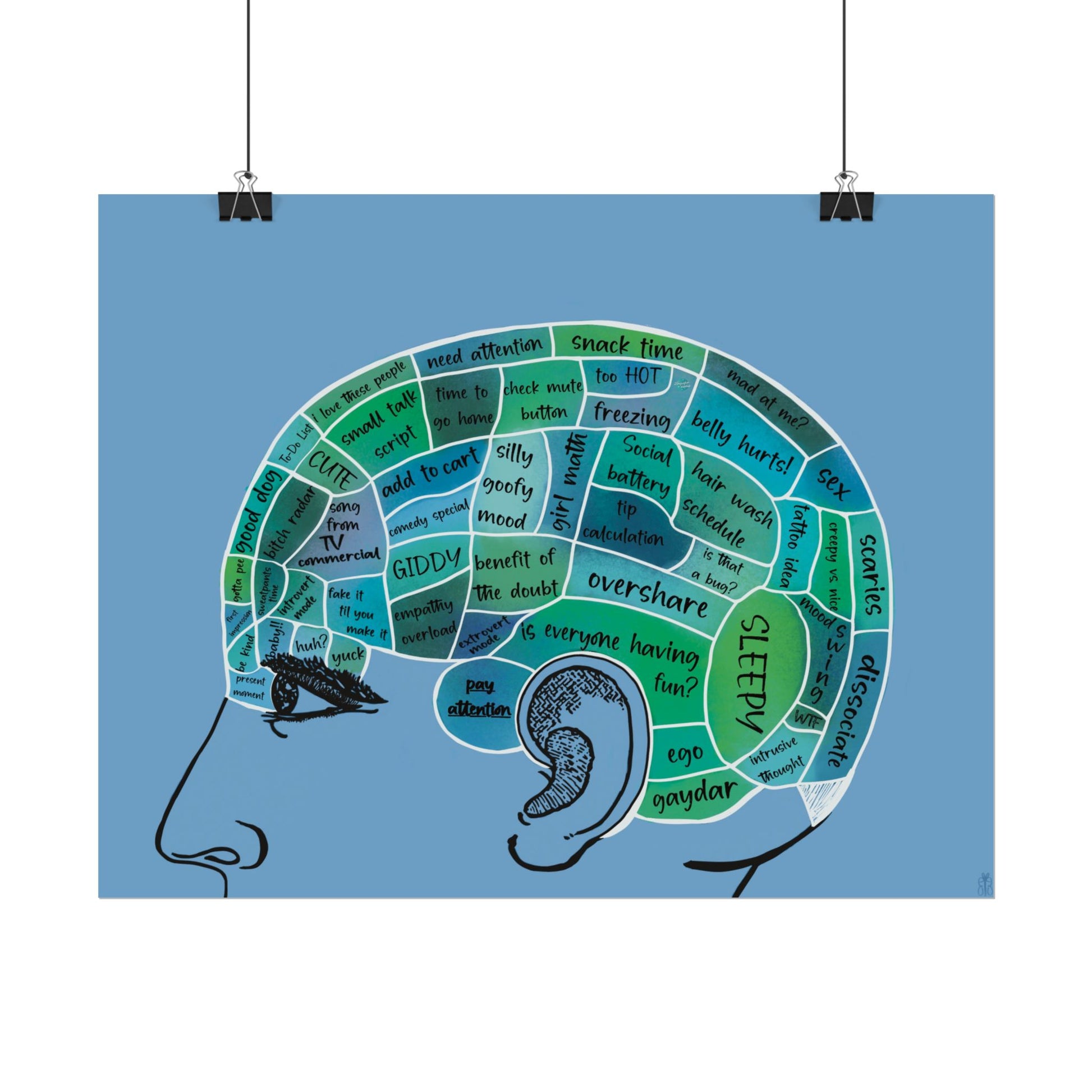 This colorful and whimsical brain map art print offers a playful look inside the mind! With admiration of "girlhood" in mind, this unique piece of wall art is ideal for mental health advocates, psychology enthusiasts, or anyone who loves quirky, modern decor with a thoughtful twist. Its vibrant colors and humorous design will brighten up any space while playfully nodding to the complexities of thoughts in our minds