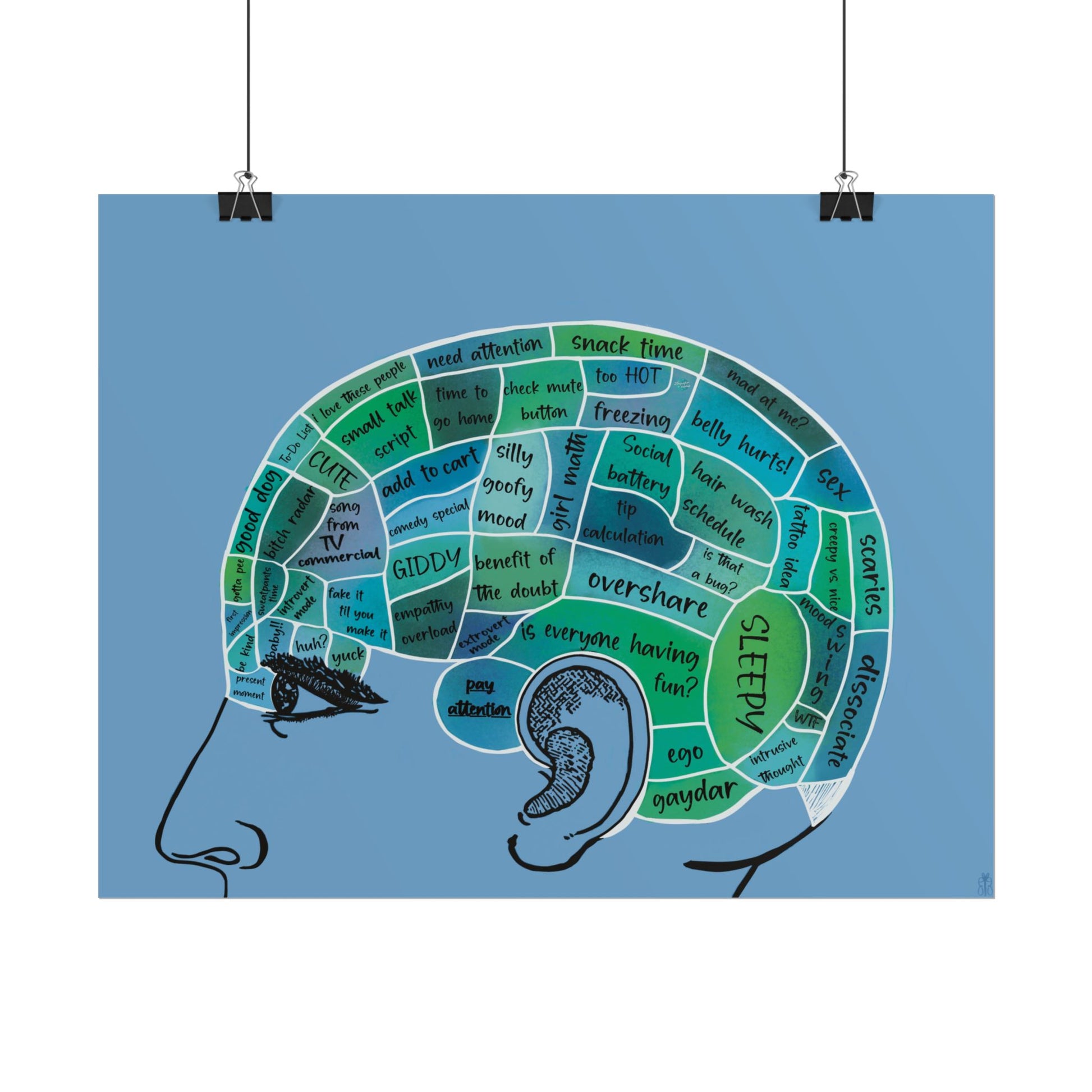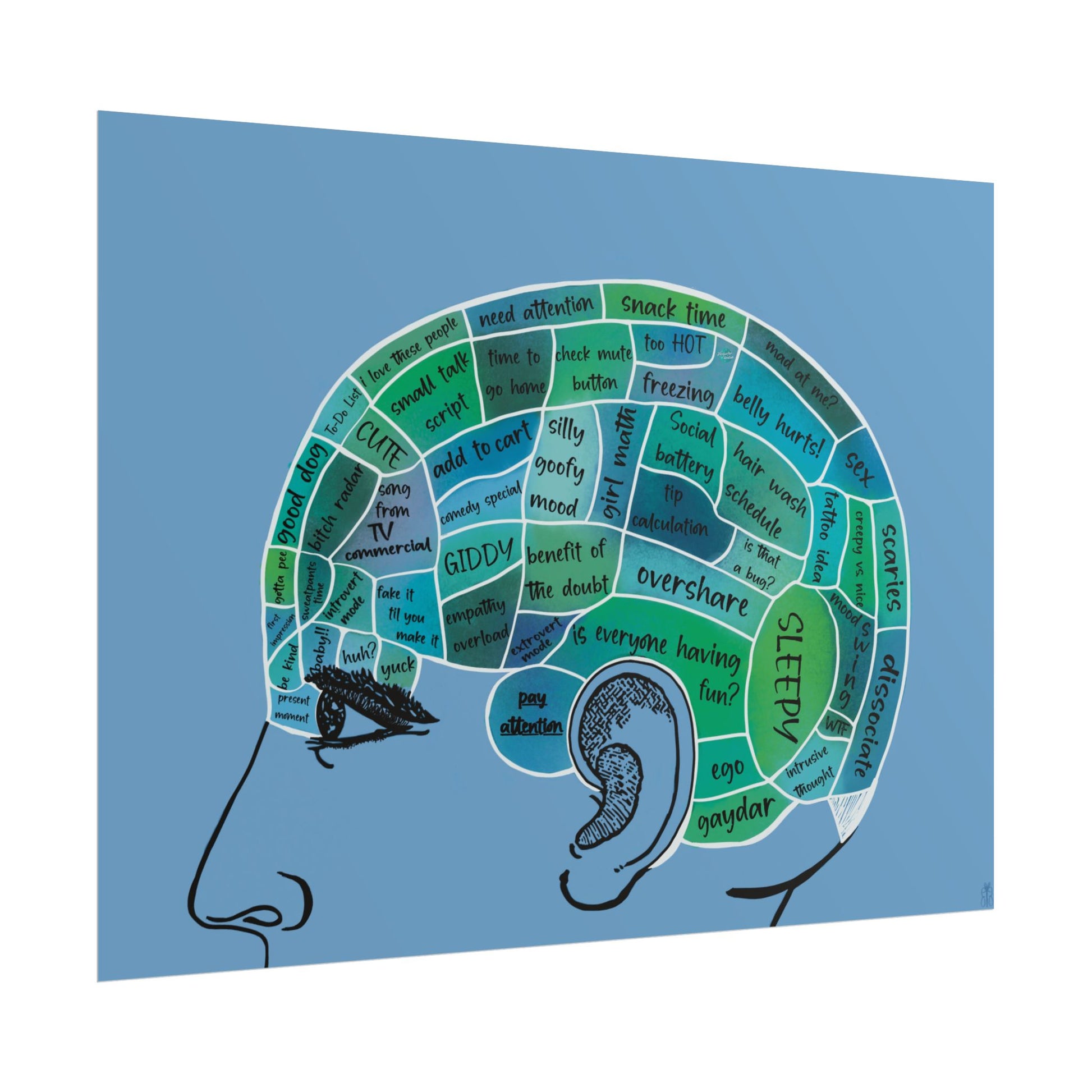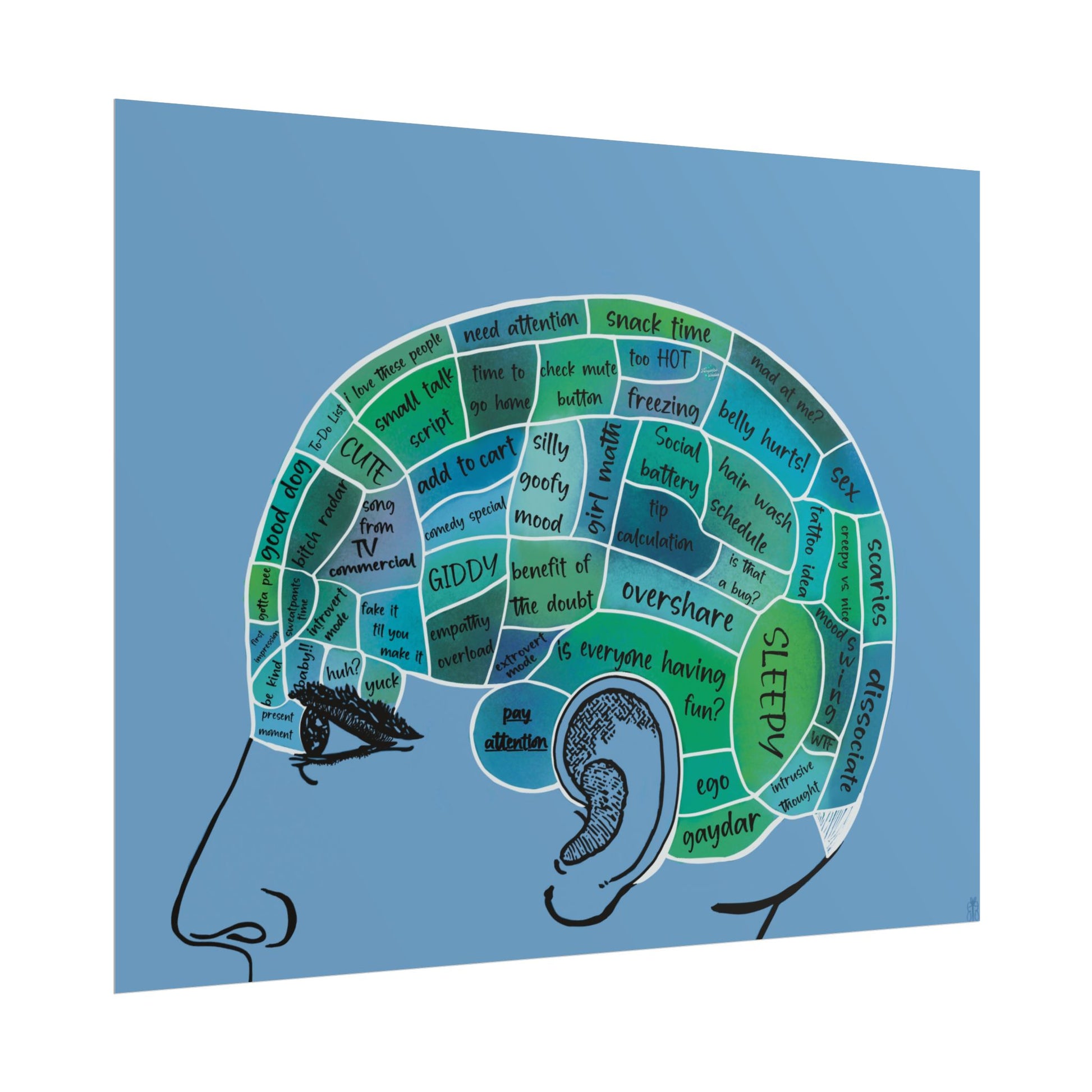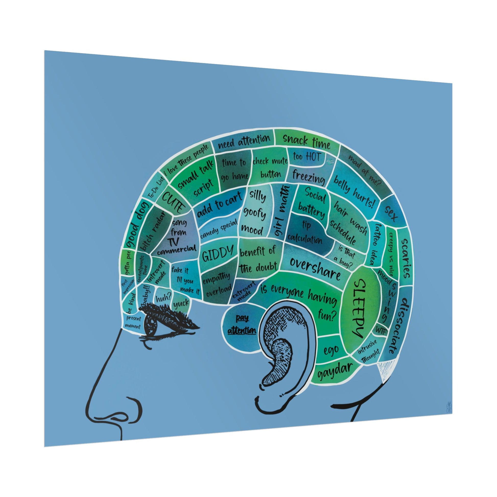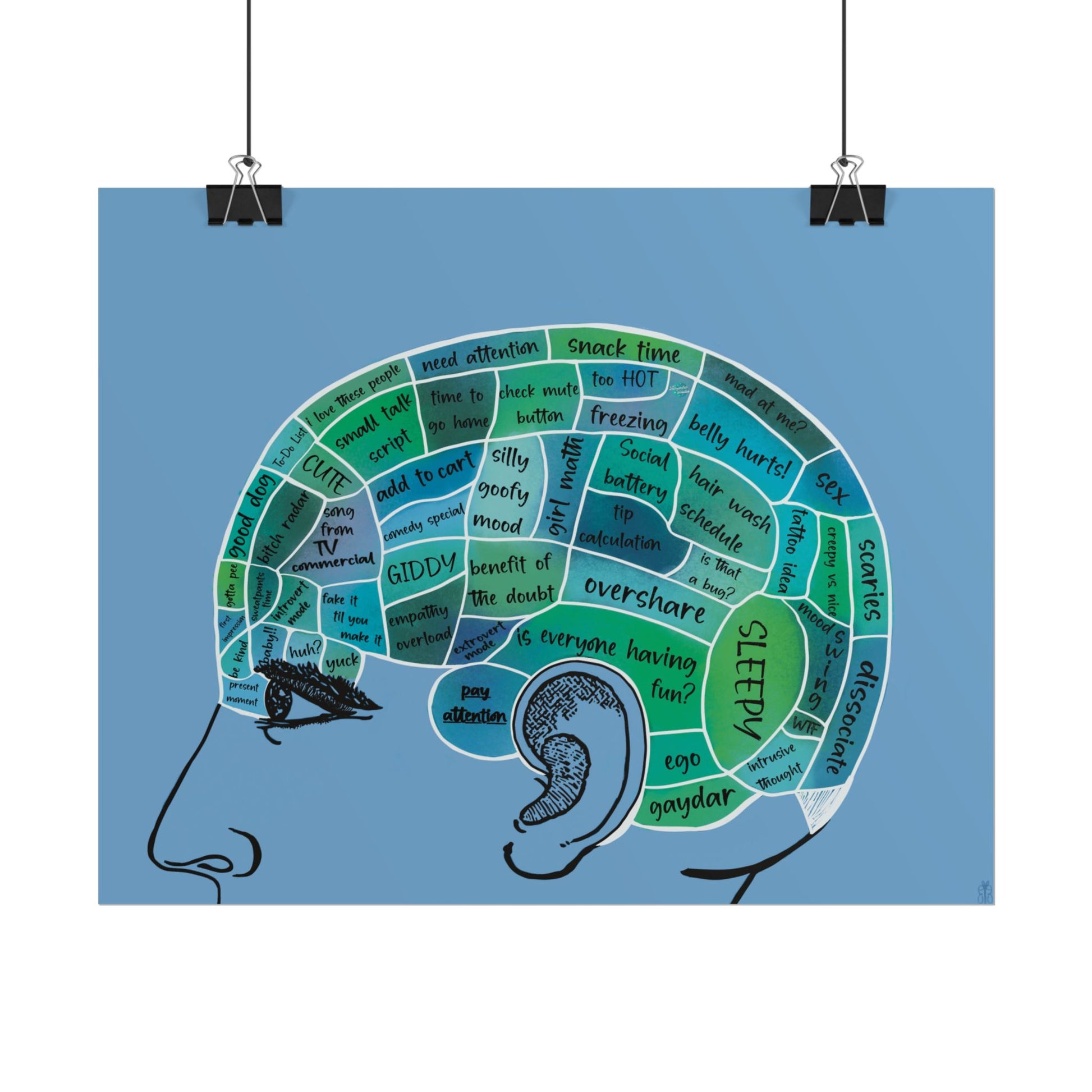 This colorful and whimsical brain map art print offers a playful look inside the mind! With admiration of "girlhood" in mind, this unique piece of wall art is ideal for mental health advocates, psychology enthusiasts, or anyone who loves quirky, modern decor with a thoughtful twist. Its vibrant colors and humorous design will brighten up any space while playfully nodding to the complexities of thoughts in our minds