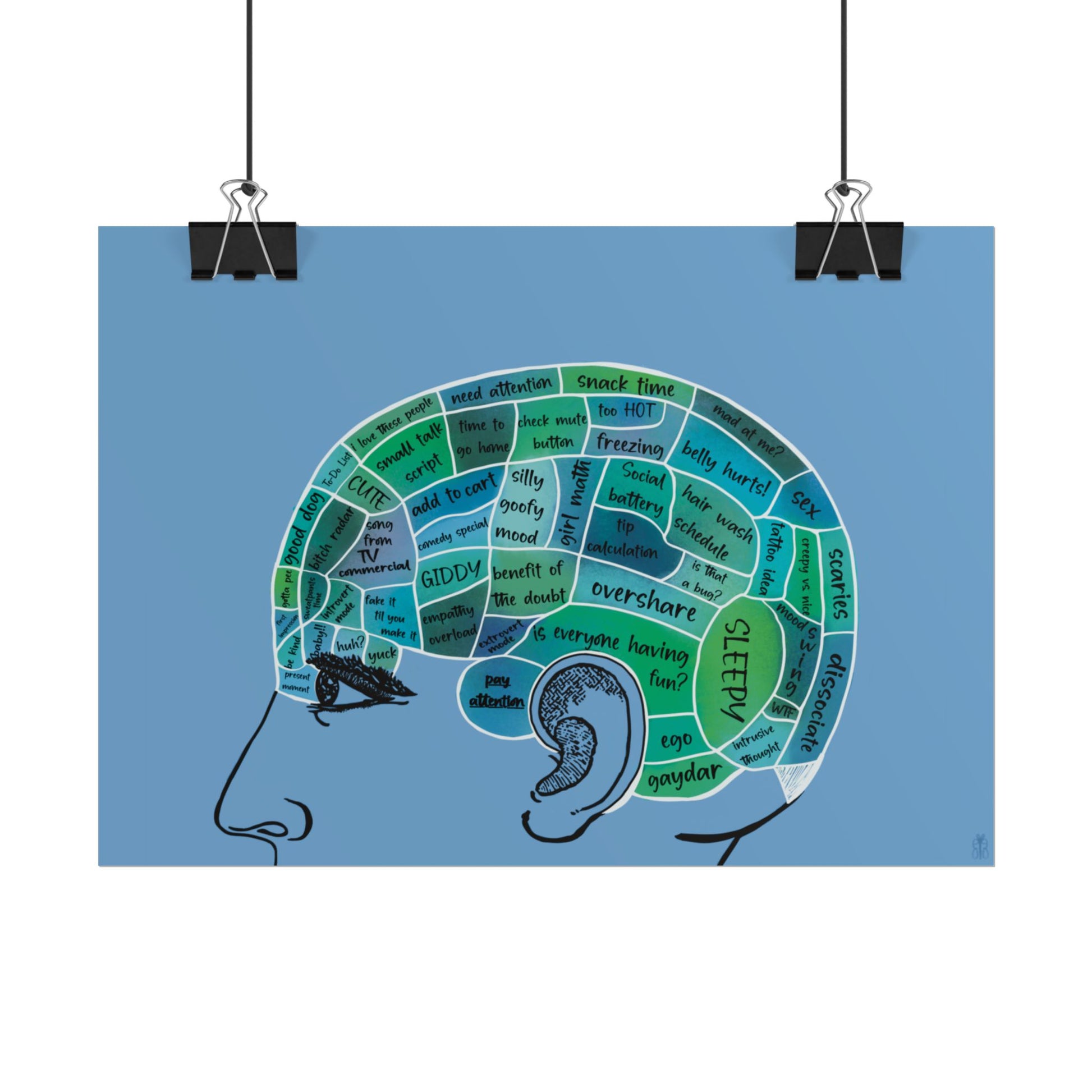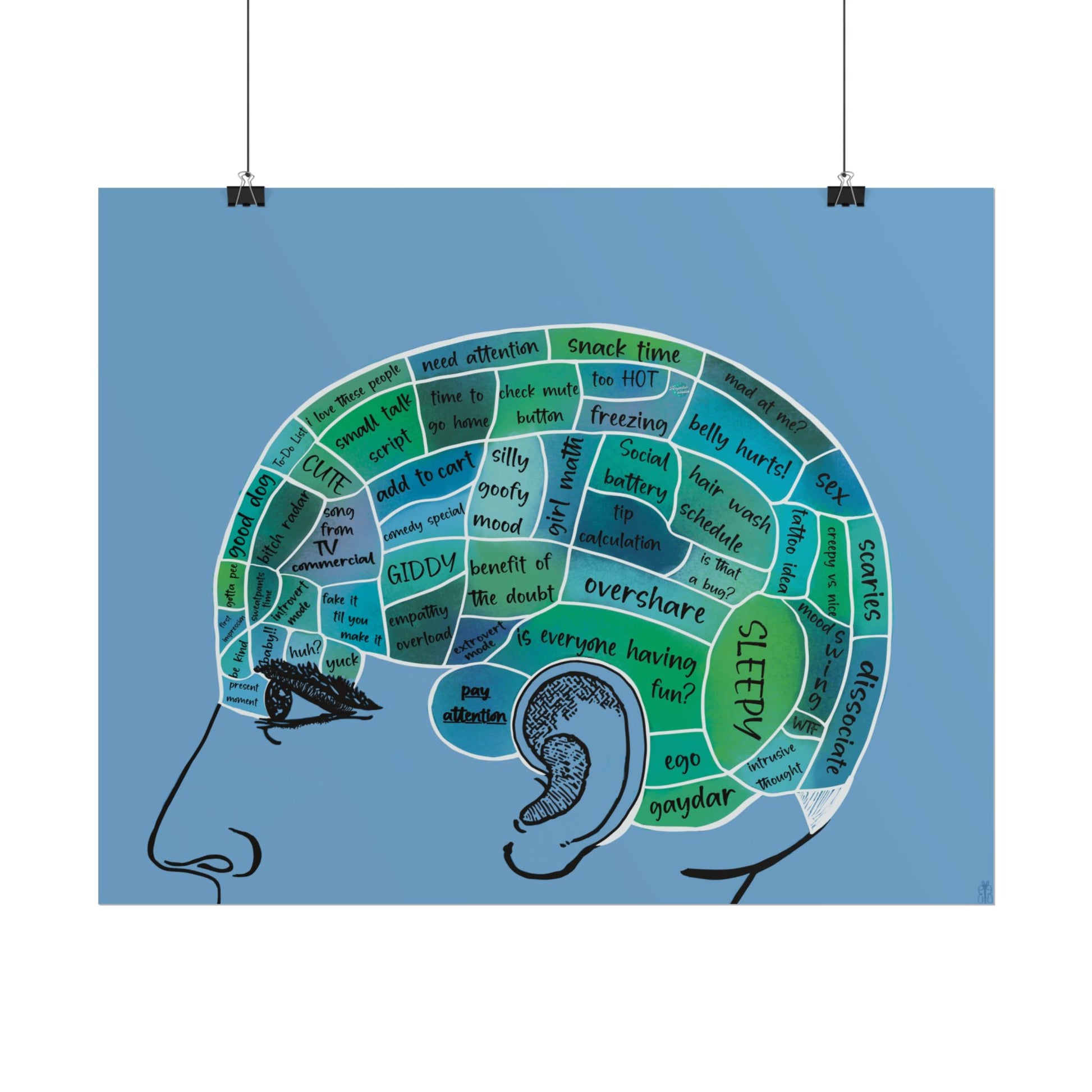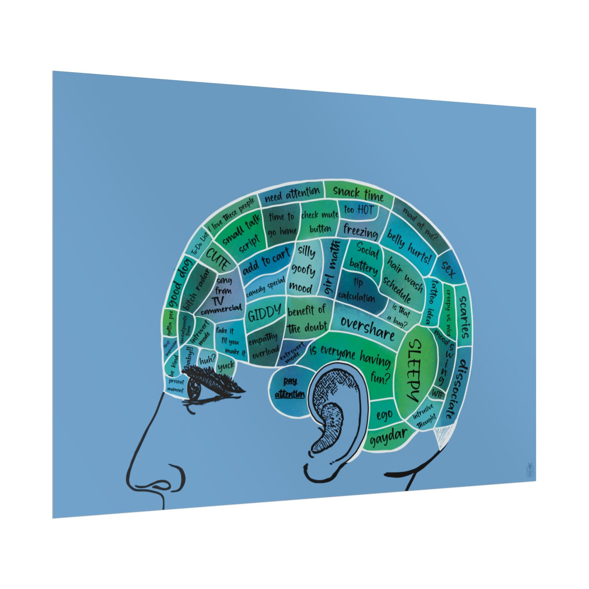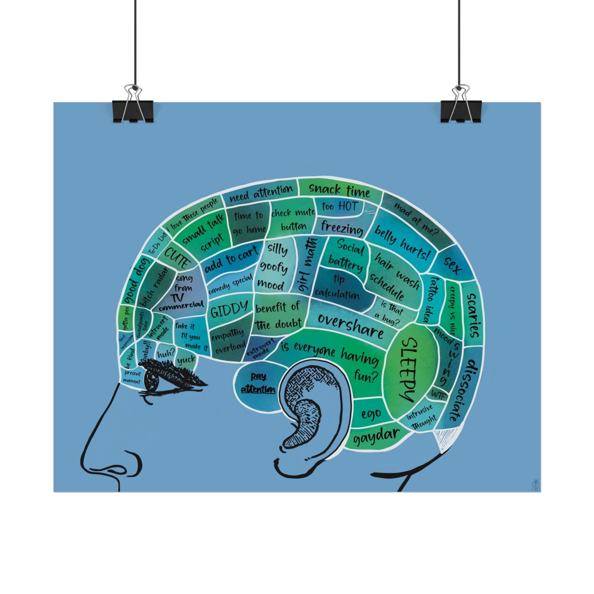 This colorful and whimsical brain map art print offers a playful look inside the mind! With admiration of "girlhood" in mind, this unique piece of wall art is ideal for mental health advocates, psychology enthusiasts, or anyone who loves quirky, modern decor with a thoughtful twist. Its vibrant colors and humorous design will brighten up any space while playfully nodding to the complexities of thoughts in our minds