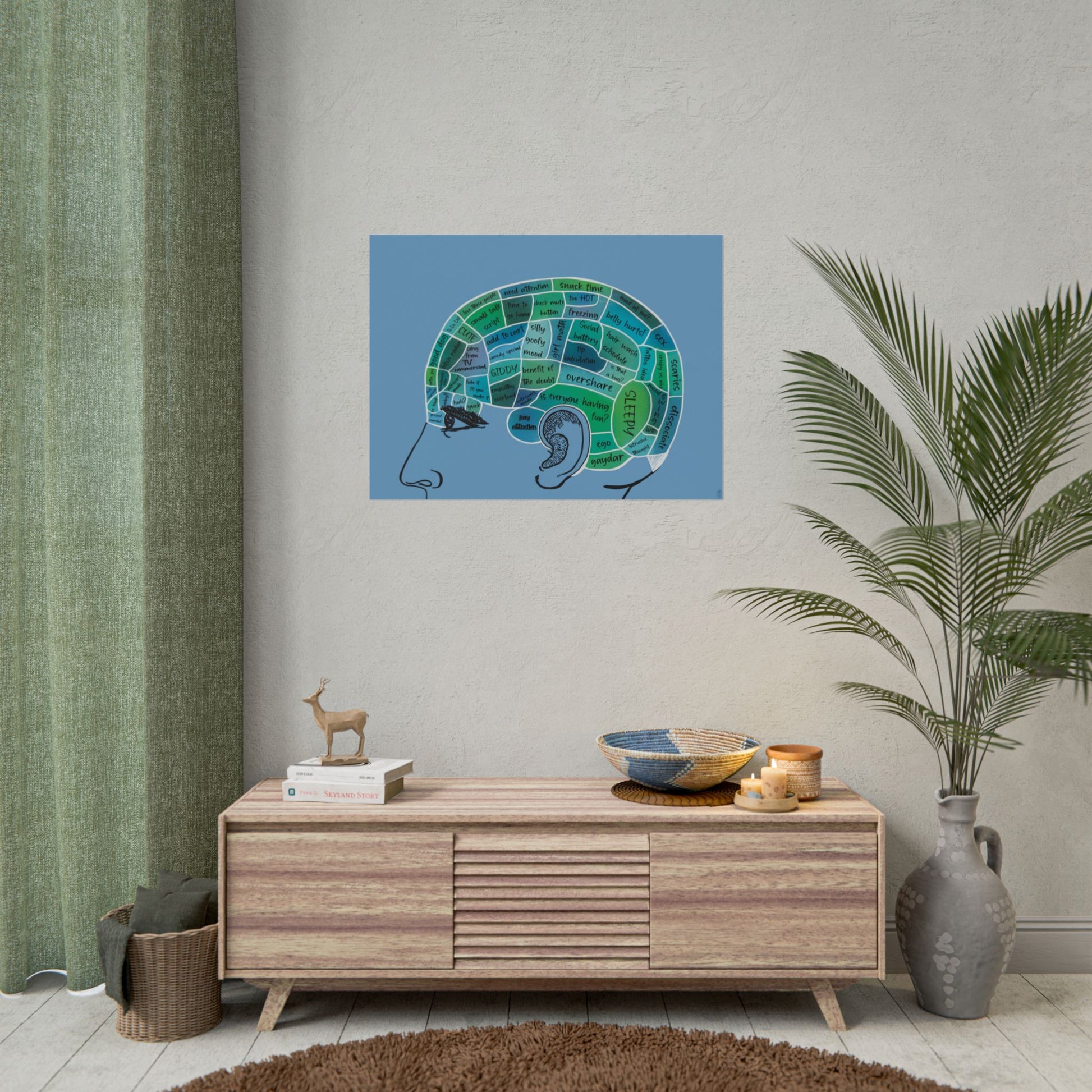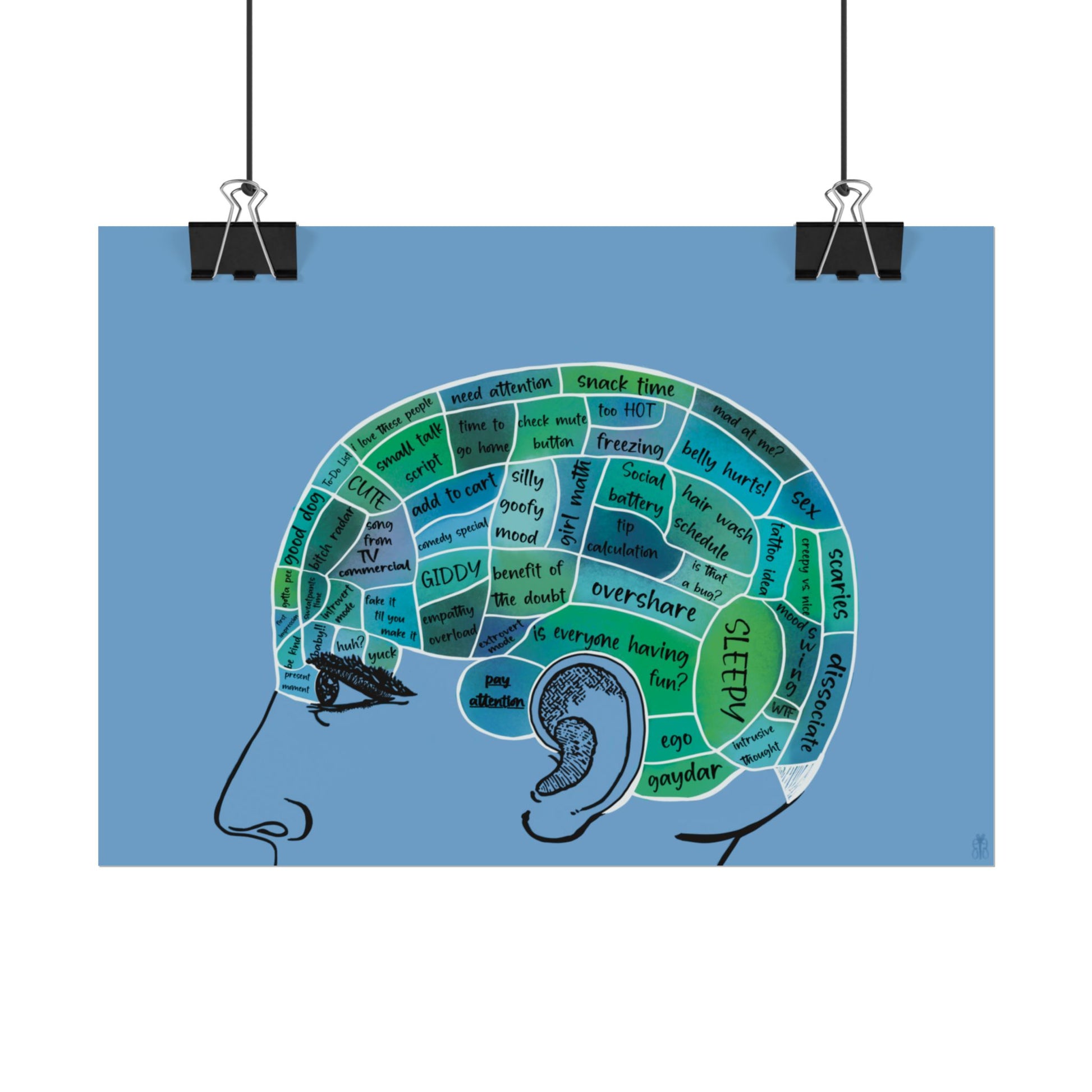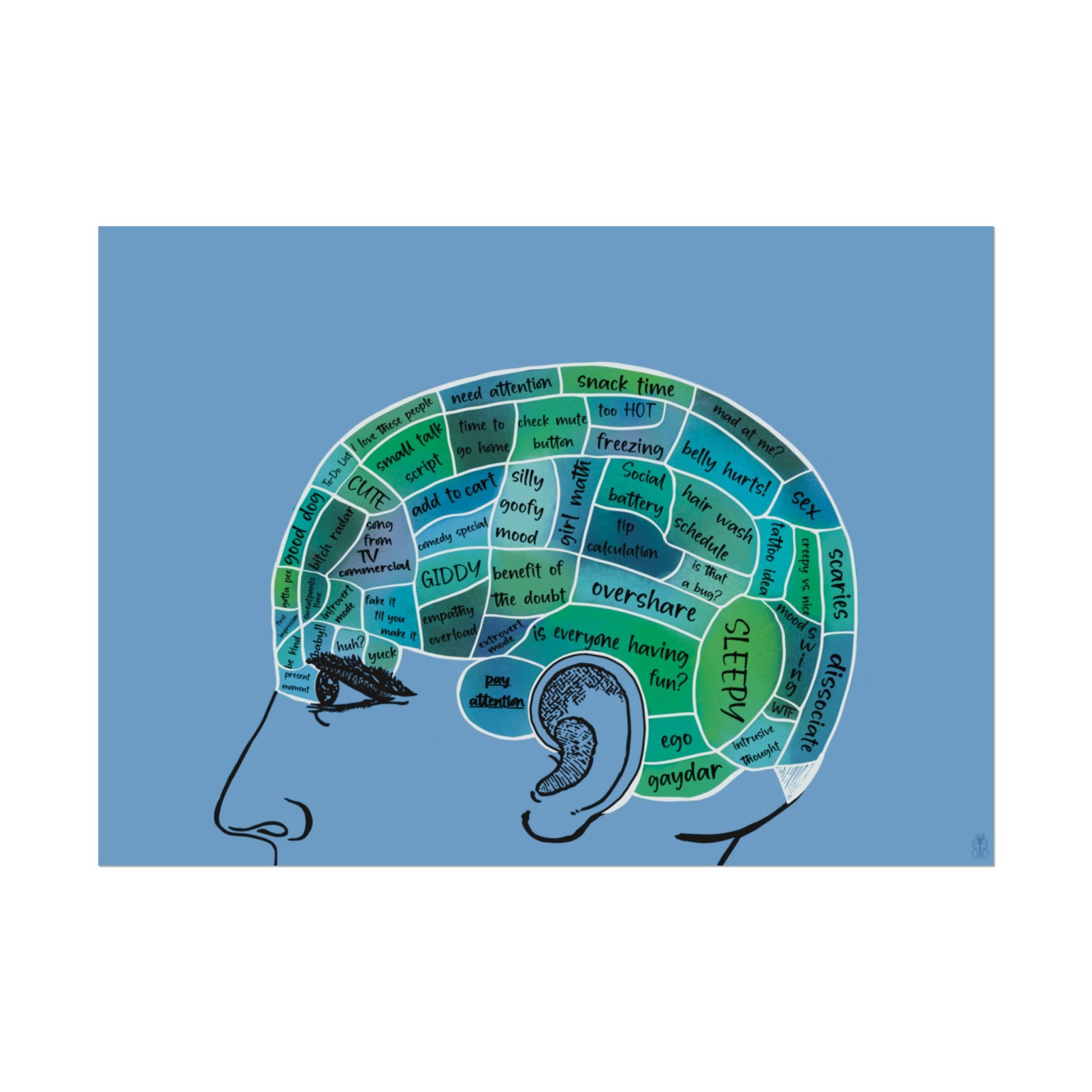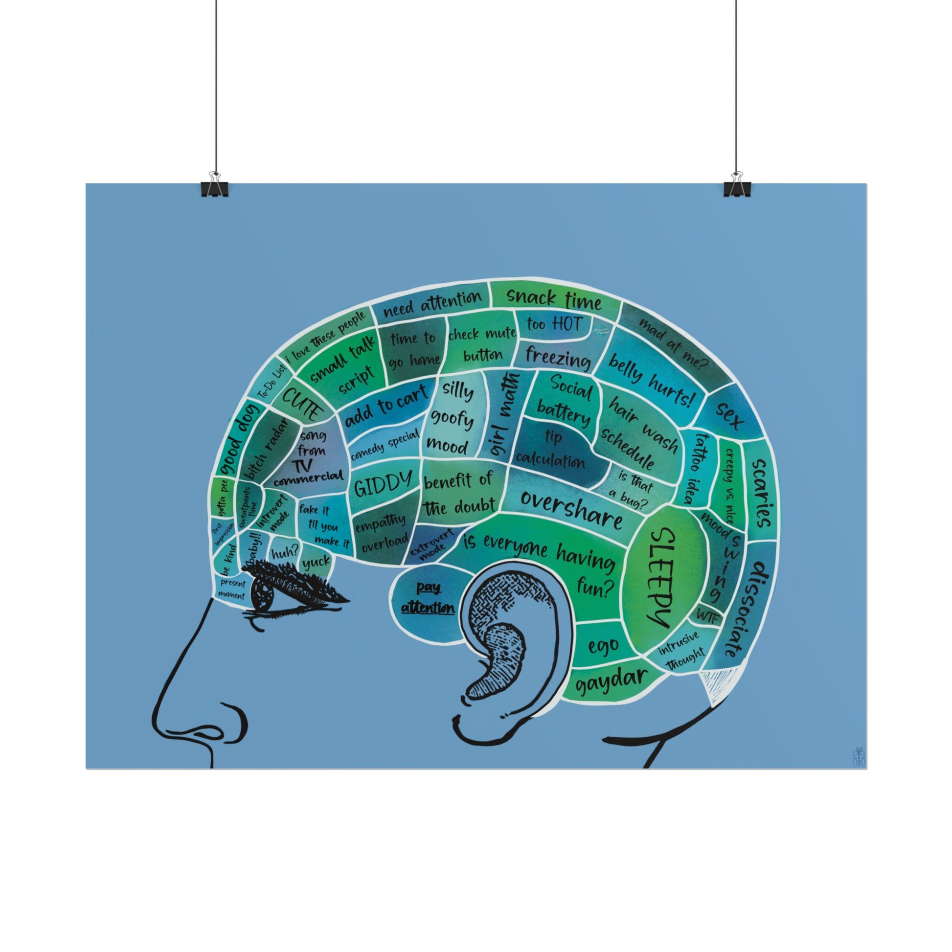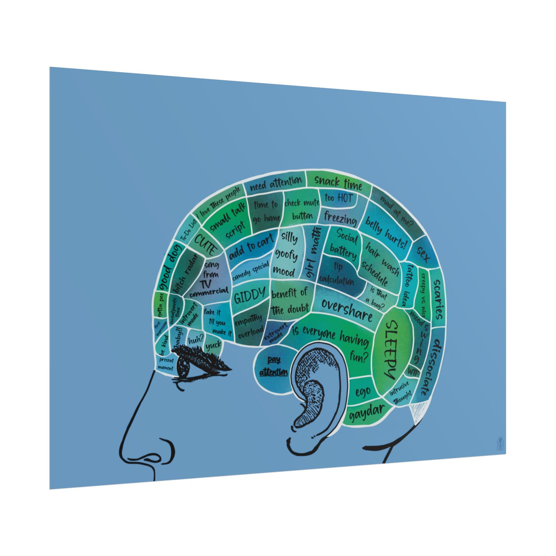 This colorful and whimsical brain map art print offers a playful look inside the mind! With admiration of "girlhood" in mind, this unique piece of wall art is ideal for mental health advocates, psychology enthusiasts, or anyone who loves quirky, modern decor with a thoughtful twist. Its vibrant colors and humorous design will brighten up any space while playfully nodding to the complexities of thoughts in our minds