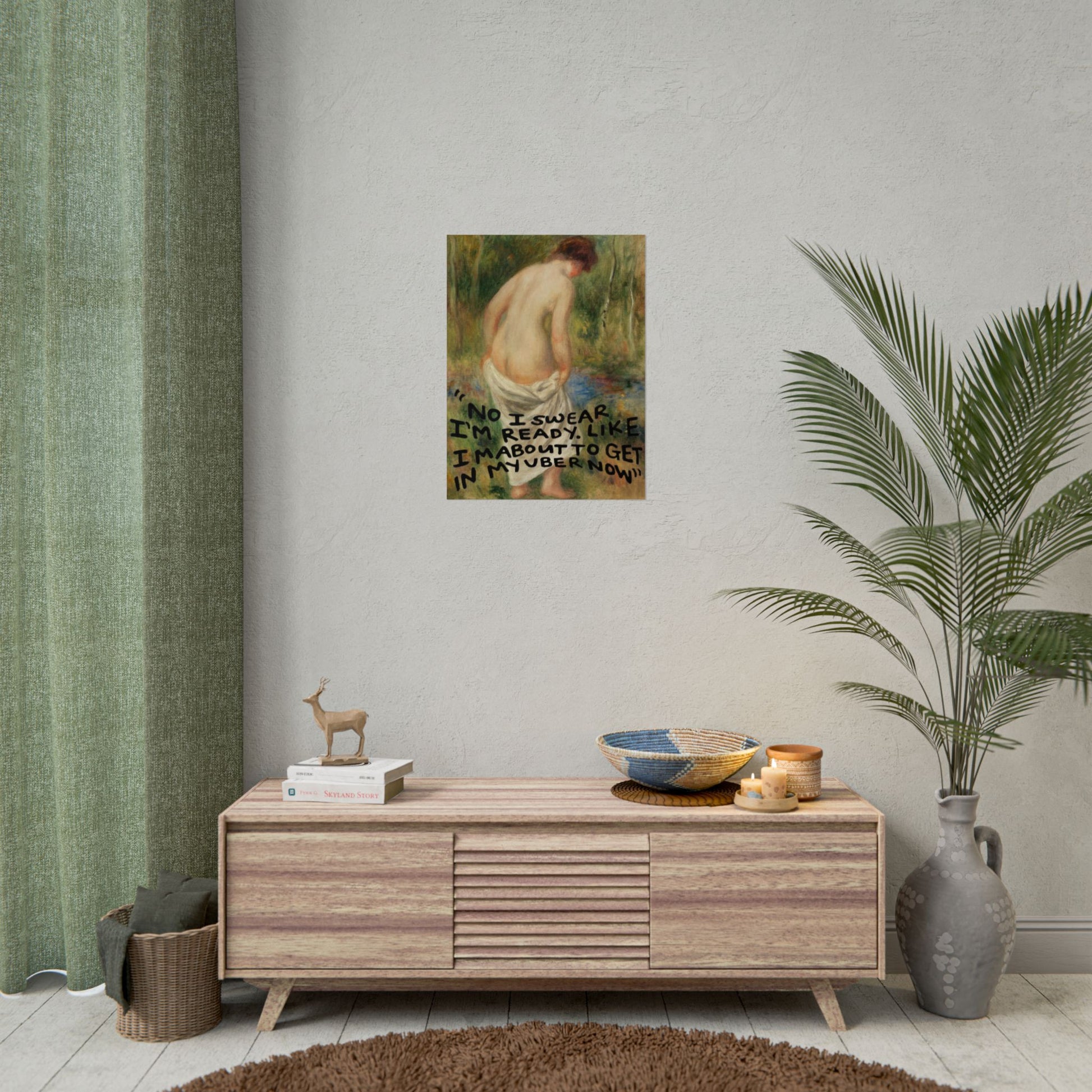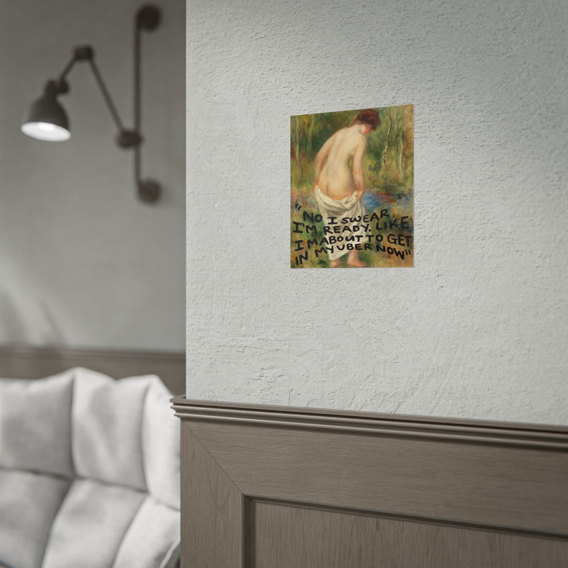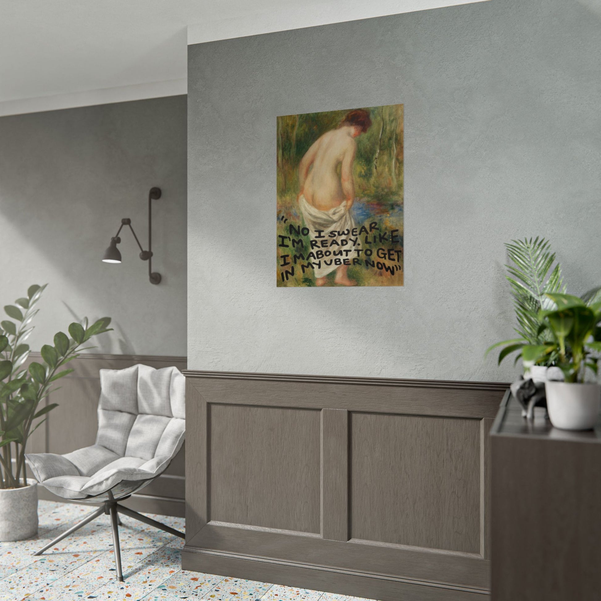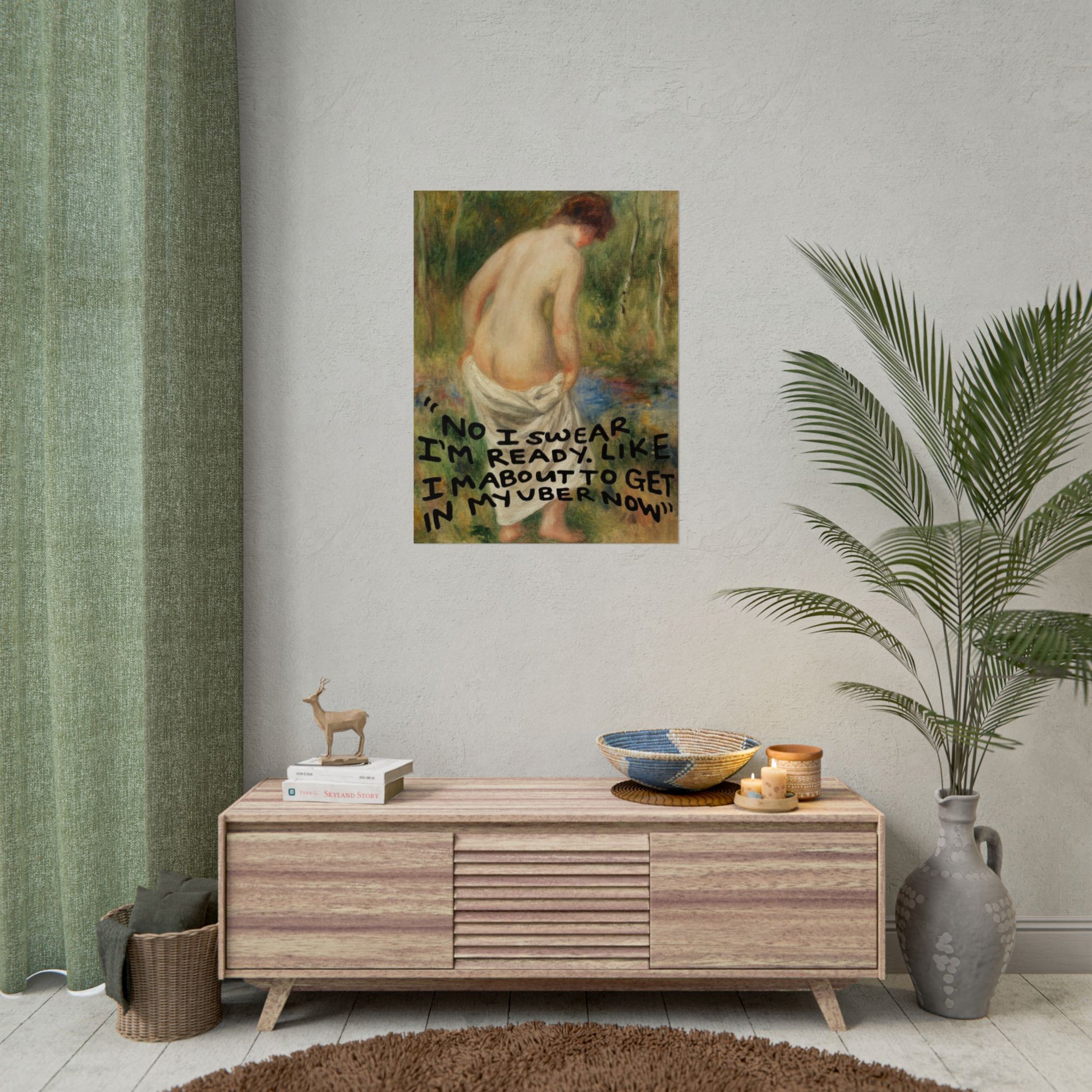 Woopsies brings together old-world charm with modern humor, overlaid on a classical painting backdrop. Perfect for chronic procrastinators and girls who are somehow always running late getting ready. Seamless addition to a gallery wall, pairing with various home décor aesthetics. Add some funny, witty energy to your space with the Woopsies poster.